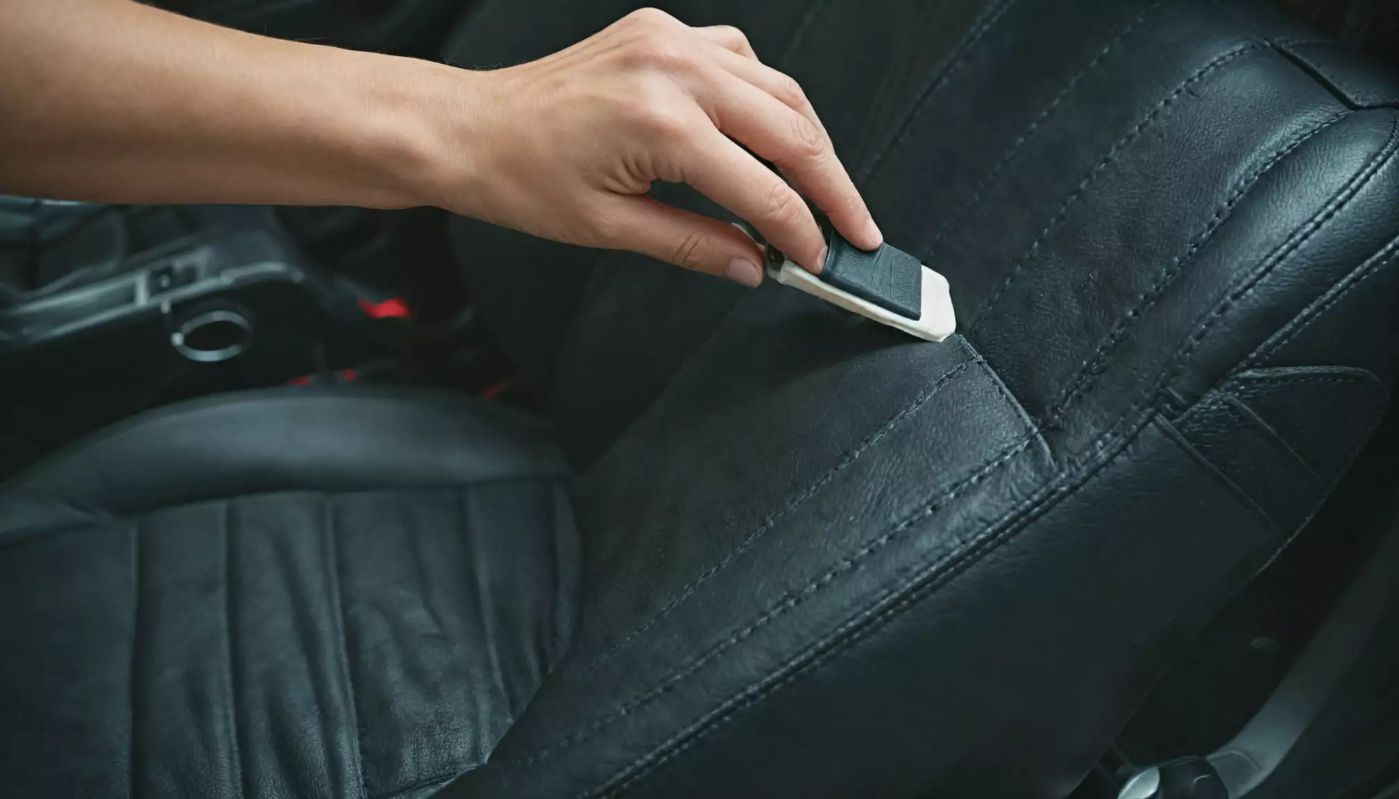 Zanim zaczniesz czyszczenie, dokładnie odkurz fotele, boczki drzwi, tunel środkowy i szczeliny przy przeszyciach. Piasek i kurz działają jak ścierniwo – jeśli przystąpisz do mycia bez ich usunięcia, możesz niechcący zarysować powierzchnię. Sprawdź, czy w zakamarkach nie ma twardych drobin lub okruchów i usuń je pędzelkiem detailingowym.
